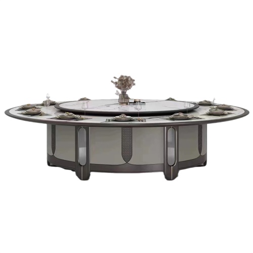 片尺寸价格说明定做服务。 酒店会所新中式轻奢电动餐桌大圆桌是一款专为高端酒店、会所、别墅等场所设计的智能餐桌。该餐桌采用实木材质,结合新中式风格,展现出轻奢的品味和气质。该餐桌配有电动转盘,可自动旋转,方便客人享用各种美食。该餐桌还配有岩板桌面,可隐形嵌入电磁炉,适合火锅、烧烤等多种用餐方式。该餐桌可根据客户需求定制不同的尺寸、颜色和款式,满足不同的装修风格和空间需求。